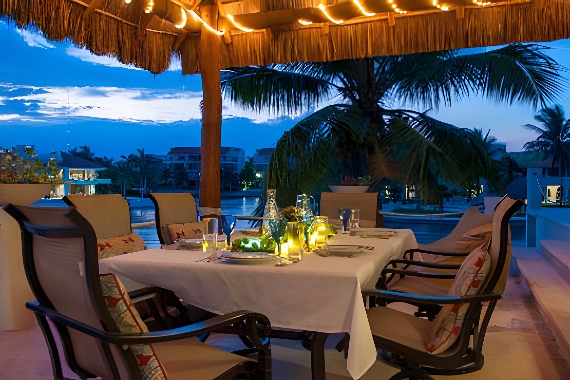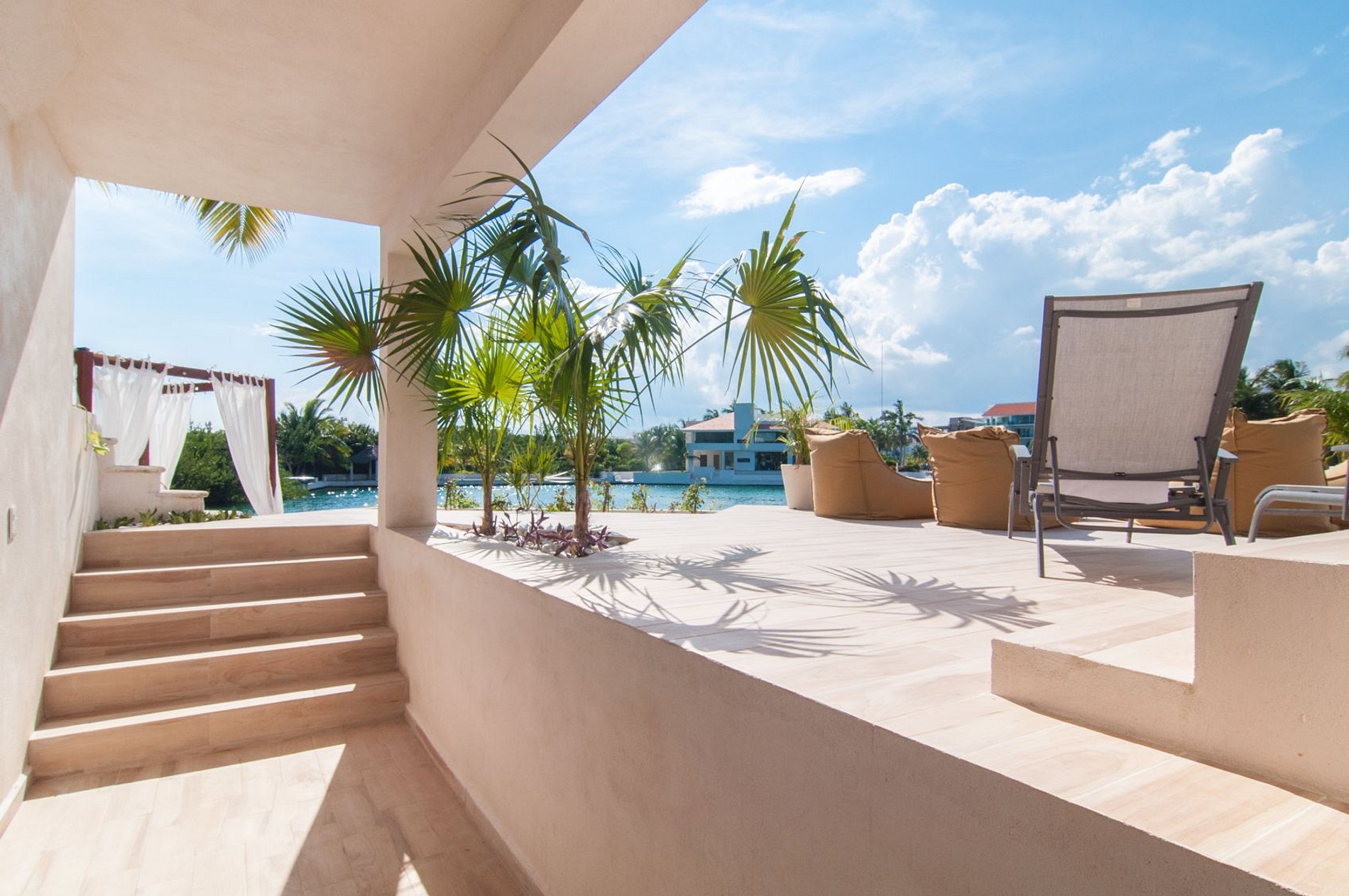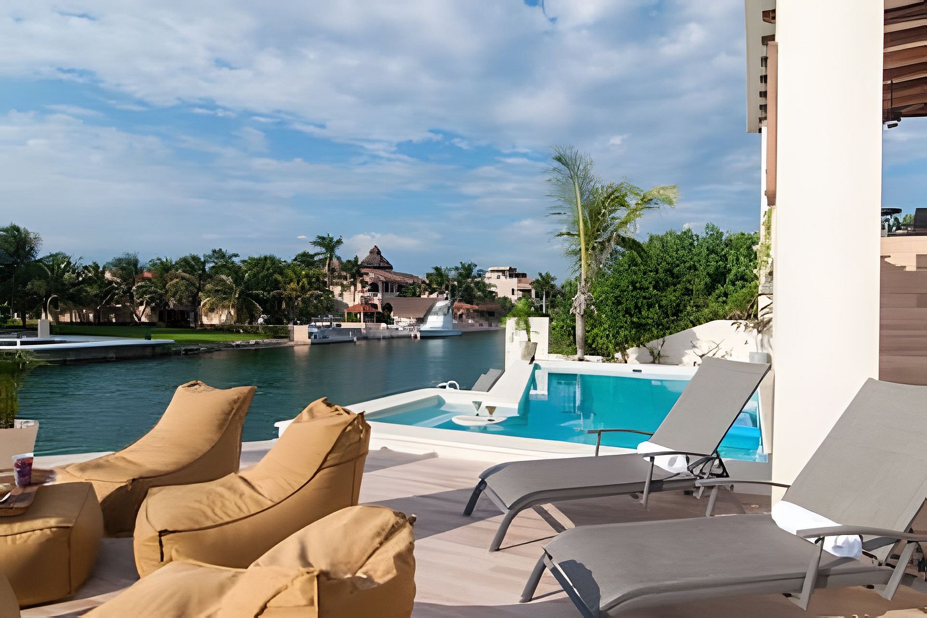 Un amplio comedor abierto, un exquisito bar de cócteles con vinoteca, un tocador contiguo y una cómoda habitación ofrecen vistas absolutamente impresionantes, con vistas a la palapa. La amplia terraza y el hermoso canal de Puerto Aventuras le impresionarán. ¡Puede salir a nadar y navegar en kayak! La gran piscina está sobre el nivel de la laguna, donde podrá relajarse en cómodos pufs, contemplar los barcos y la naturaleza. También puede pescar directamente desde la terraza inferior.