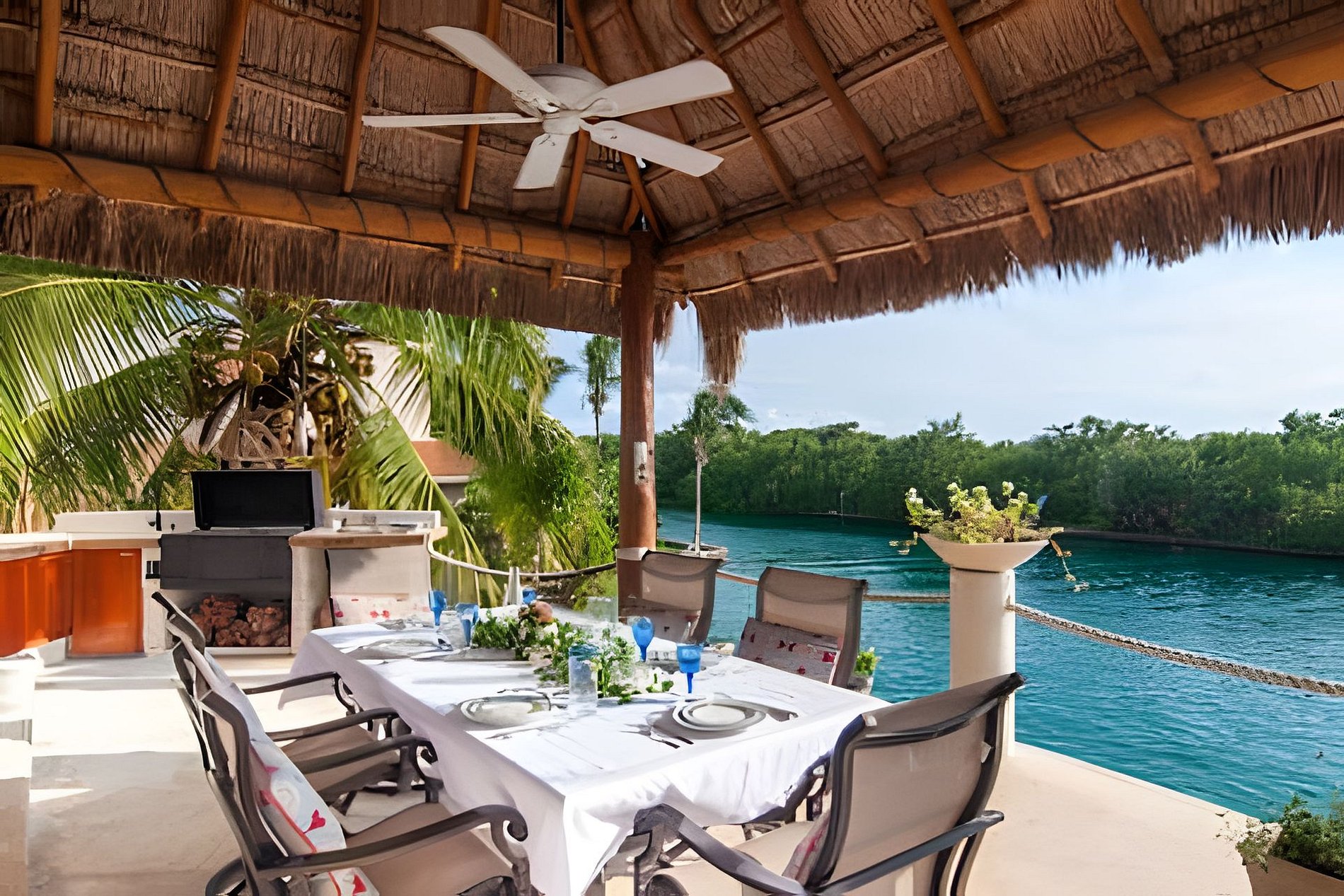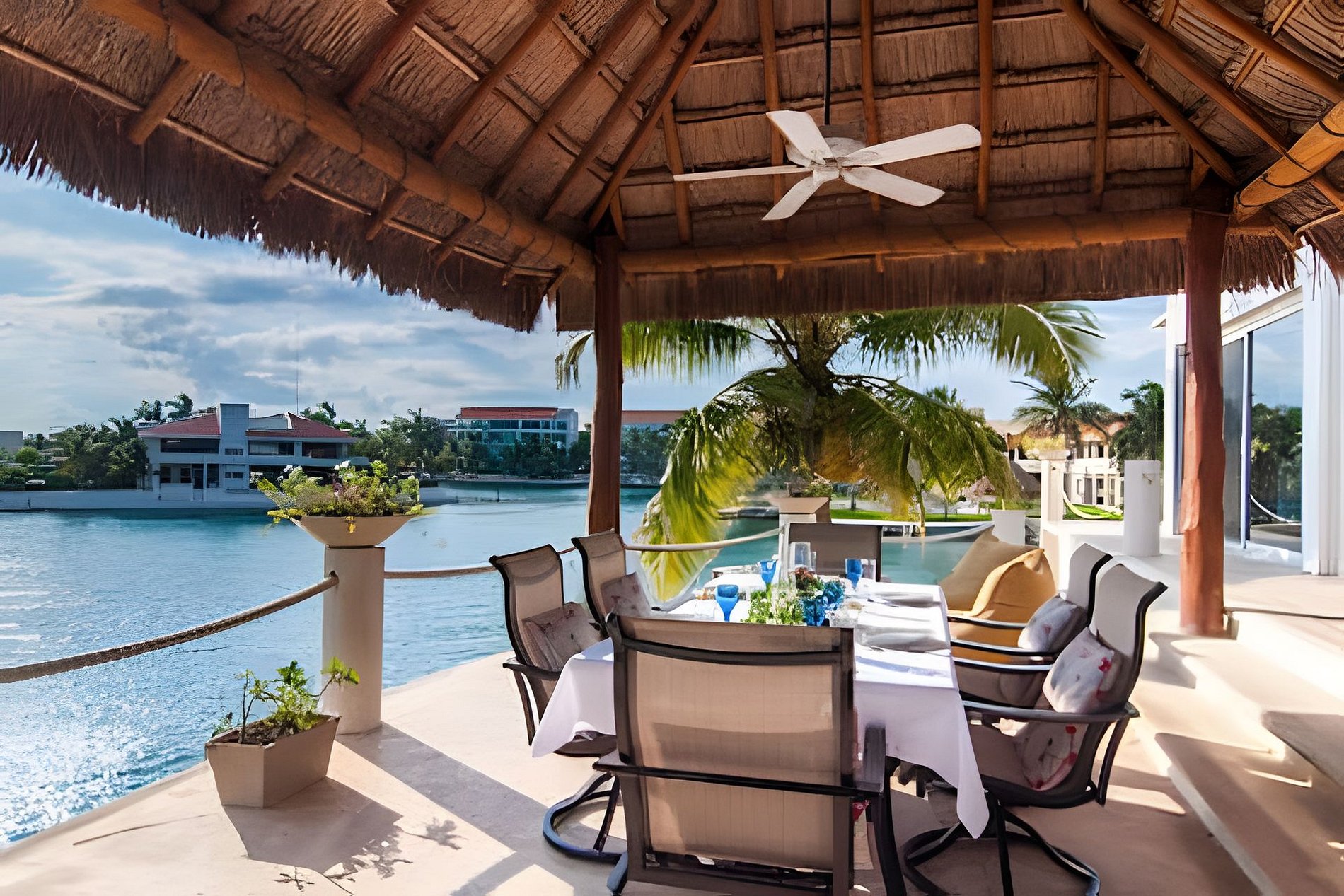 Une grande salle à manger ouverte, un bar à cocktails exquis avec refroidisseur à vin, une salle d'eau adjacente et une chambre confortable offrent toutes une vue absolument imprenable, donnant sur la Palapa. La grande terrasse couverte et la magnifique voie navigable océanique de Puerto Aventuras vous impressionneront. Vous pouvez sortir et nager, faire du kayak ou pagayer dans l'océan ! La grande piscine est directement au bord de l'eau où vous pourrez vous prélasser dans les confortables poufs, regarder les bateaux et la nature. Vous pouvez également pêcher directement depuis la terrasse inférieure.